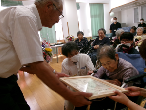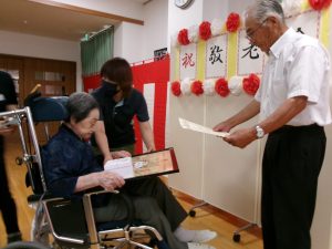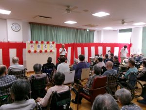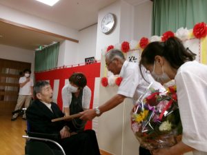 お知らせ 令和7年度 敬老会🍁 掲載日:2025年10月01日(水) <特養あずま・ショートステイあずま> 9月12日(金)、敬老会を行いました✨ 今年は、百寿の方が2名、長寿の方が2名いらっしゃいました!おめでとうございます✨ 賀詞、記念品贈呈の後は職員による大黒舞披露でした!皆様、華やかな舞に感動し、自然と手拍子をしていらっしゃいました👏楽しい雰囲気で行われた敬老会に入居者様も笑顔がみられました! 末永く、お元気でいてくれることを職員一同祈っております✨