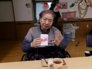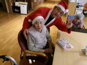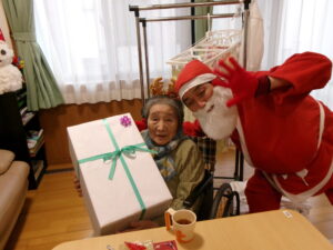 サンタがプレゼントをもって登場!入居者の皆様にクリスマスのプレゼント!笑顔でプレゼントを受け取っていらっしゃいました✨中身にワクワクする様子も見られました🎁